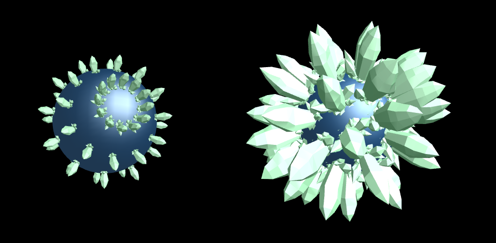 星(球体)に水晶のような結晶を生やした3Dグラフィックスを作りたい。生徒からの質問 サイエンス記事 2019.07.242019.07.25 プログラムを使ってアート作品を作成しているときに、生徒から表題の要望を頂きました。 水晶は大きくしたり、小さくしたりしたいとのことです。 こういうのを作ってみたいという動機は大事ですね。 早速作ってみましたが、プログラムの中身については生徒さんに理解してもらえるように追々説明していきます。 https://ex-gram.com/wp-content/uploads/2019/07/crystal_short.mp4