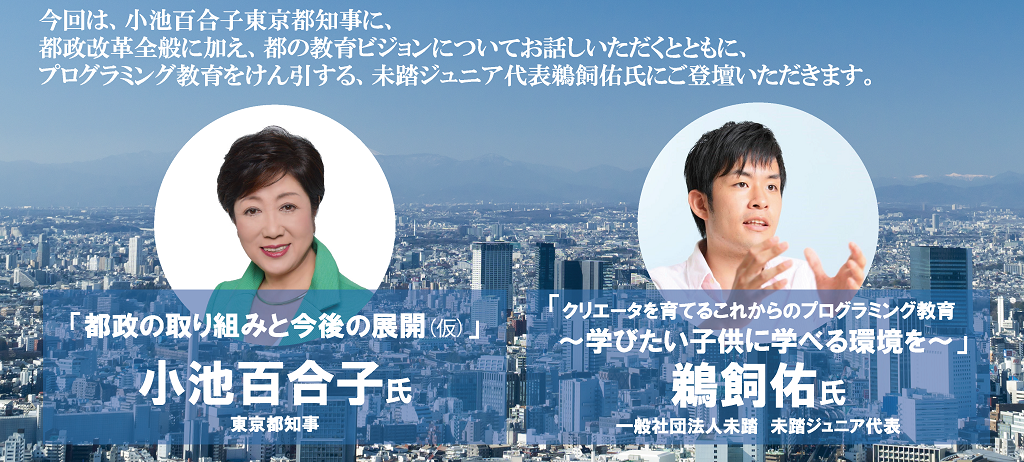 プログラミング教育などの次世代教育の実現を掲げる福島りえこ都議会議員の都政報告会において、小池百合子東京都知事に都の教育ビジョンについてお話しいただくとともに、プログラミング教育をけん引する、未踏ジュニア代表鵜飼佑氏にご登壇いただくとのことです。