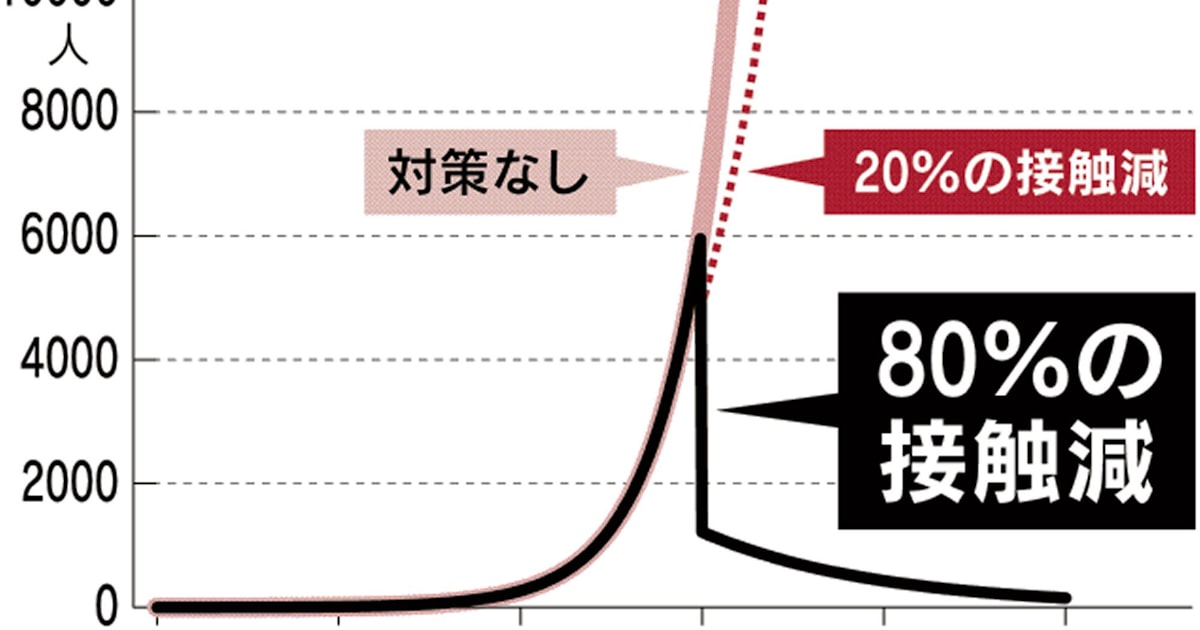 ■報道によれば人との接触を80%削減すると新型コロナウイルスの新規感染者数を短期間で大幅に削減できるとのことです。