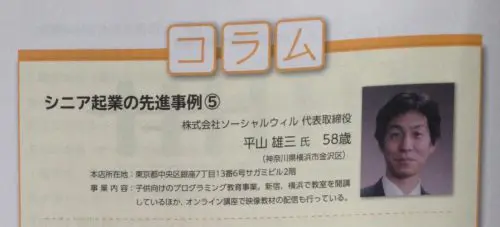 かながわシニア起業スクール ハンドブックのコラムに掲載 メディア掲載 2017.02.062019.02.14 昨年の話ですが、かながわシニア起業スクール ハンドブックで起業の先進事例としてコラムに掲載して頂きました。 プログラミング教室起業のきっかけ、起業して苦労したこと、その苦労をどう乗り越えたのか、やりがいを感じる瞬間、将来の展望などを述べています。 神奈川県より様々なイベントで配布される予定とのことです。 まだまだこれからですが、これから起業される方に少しでも役立ってくれればと思います。